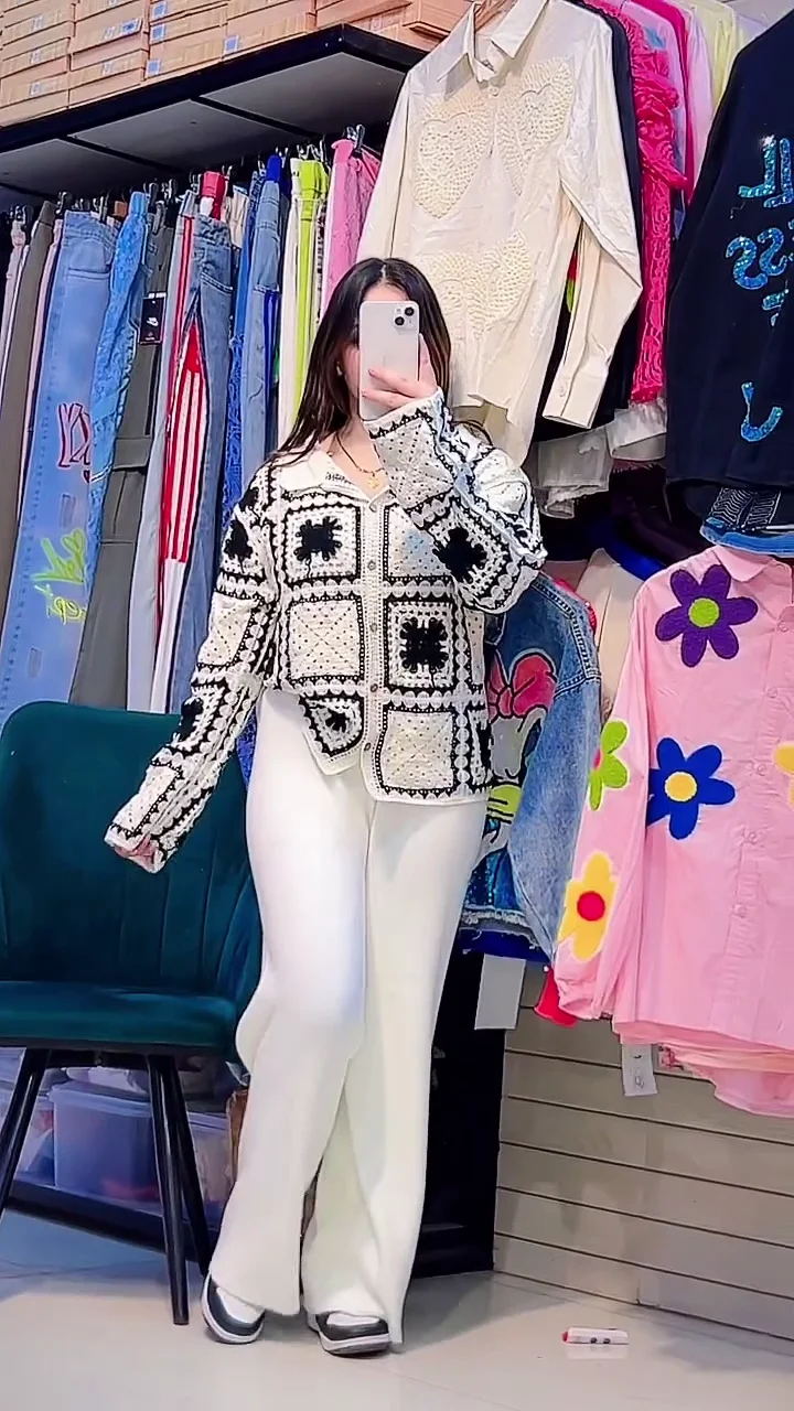 Bold Black & White Contrast: The classic monochrome palette enhances the geometric design, making the cardigan versatile, eye-catching, and easy to pair with multiple outfits.