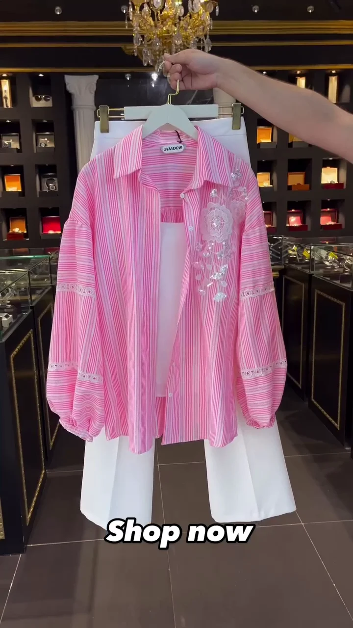 Chic 3-Piece Pink Stripe & Lace Detailed Set – Oversized Button-Down with 3D Floral Appliqué, Ribbed Camisole & Elegant High-Rise White Flared Trousers