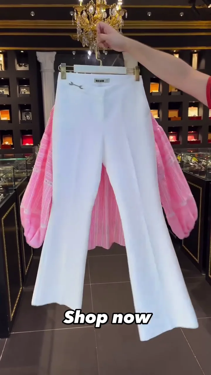 Flattering Trousers: Paired with premium white high-waist trousers that feature a signature flare and a tailored fit through the hip.