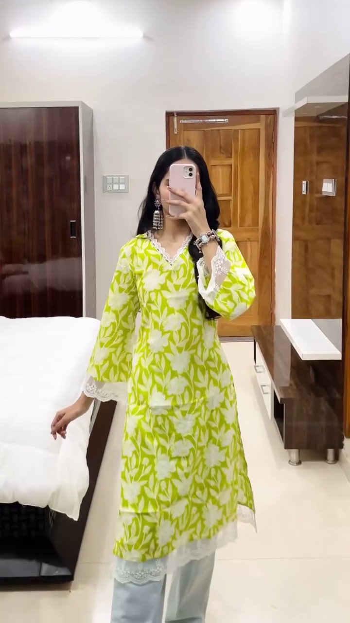 Color Variants: Available in lime green and baby pink, both featuring soft floral prints
