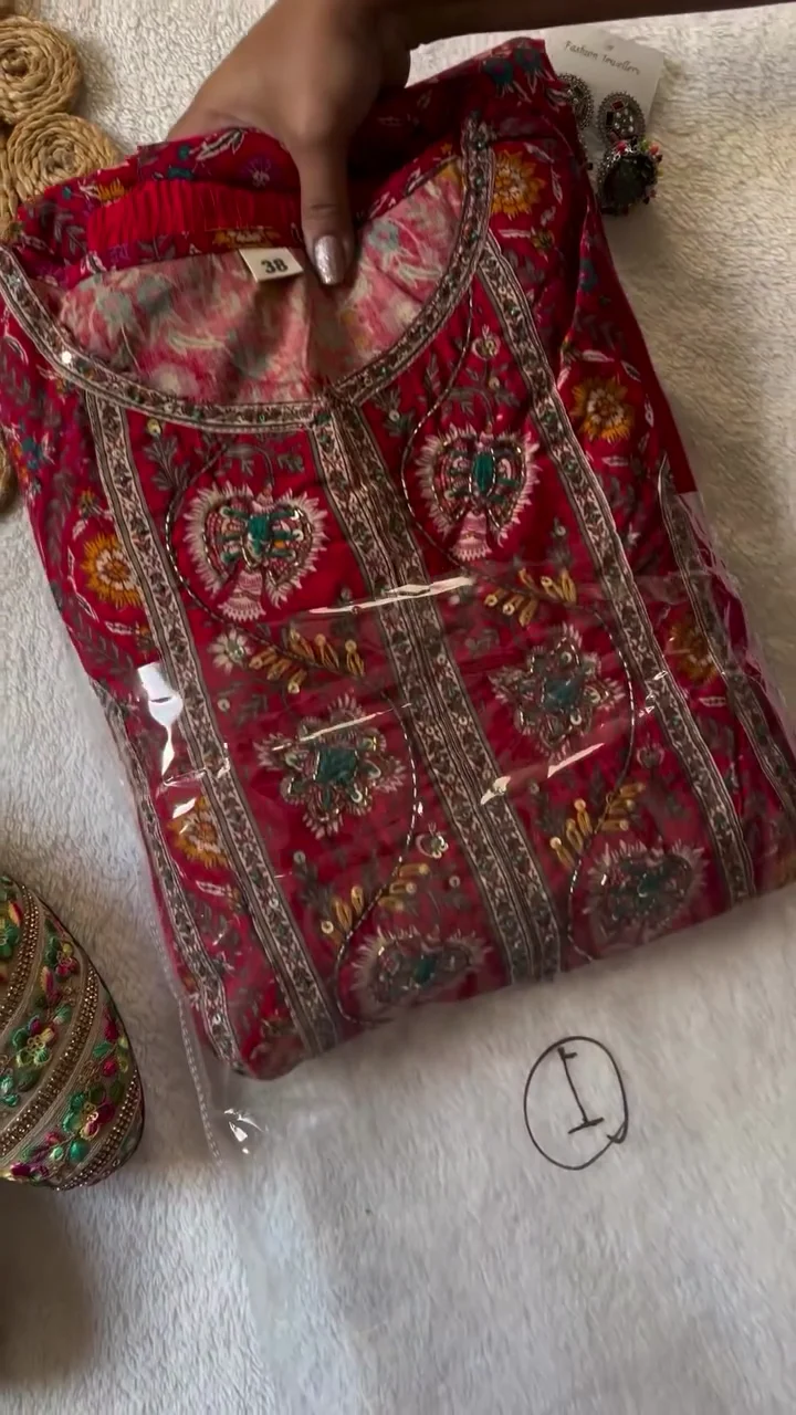 Complementary Bottoms: Comes with a pair of matching solid red straight-fit trousers that provide a clean, balanced contrast to the heavy print of the kurta.