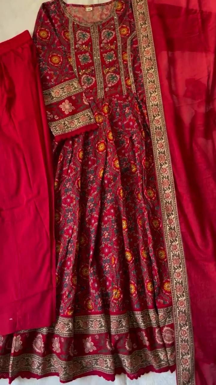 + Free ShippingElevate your ethnic wardrobe with this stunning 3-piece Anarkali suit set. Drenched in a rich, deep red hue, this ensemble combines traditional Indian craftsmanship with a modern silhouette. Featuring intricate floral motifs and delicate sequin detailing, it is the perfect choice for festive celebrations, weddings, or high-end social gatherings.