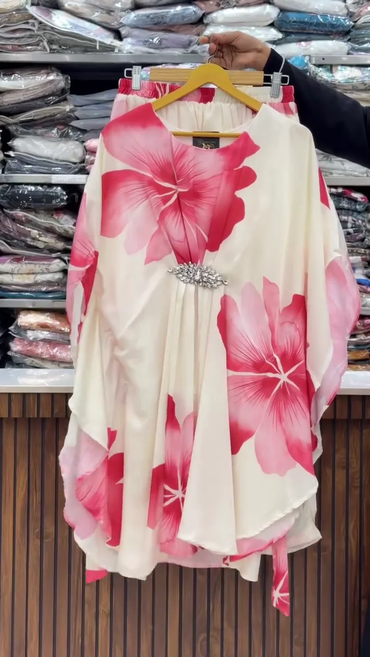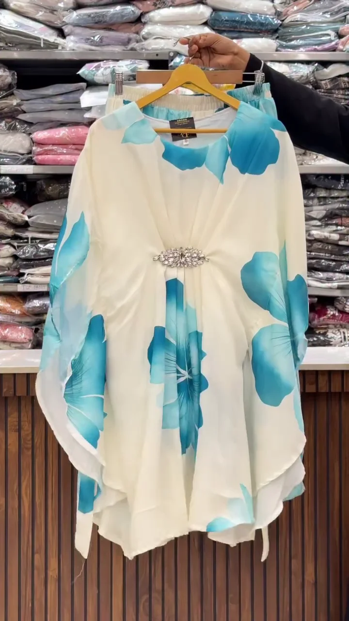 + Free ShippingStep into effortless elegance with this stunning floral kaftan-style tunic. Designed with a breezy, oversized silhouette, this piece features a soft, lightweight fabric adorned with bold, artistic floral prints in vibrant hues of azure blue and magenta pink. The center of the garment is gracefully cinched with a sparkling crystal-encrusted brooch, creating beautiful pleats that flow into a feminine drape. The wide butterfly sleeves and asymmetrical hemline offer a relaxed yet sophisticated look, perfect for resort wear, garden parties, or elevated loungewear. Whether worn as a standalone tunic or as a coordinated set, this piece combines comfort with high-fashion appeal.