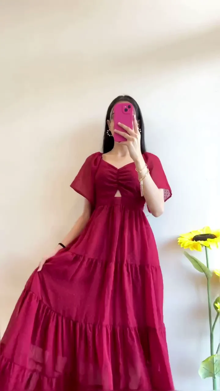 Maroon Puff Sleeve Maxi Dress ? Designed with stylish puff sleeves, a ruched bodice, and subtle cut-out details, offering a feminine and flattering silhouette.