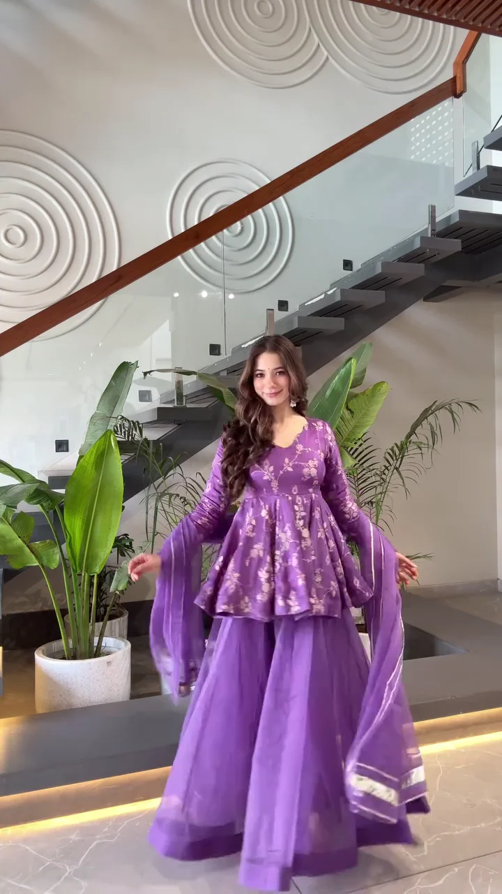 Royal Lavender Floral Organza Sharara Set – Peplum Style Kurta with Gota Patti Dupatta and Flared Sharara Bottoms
