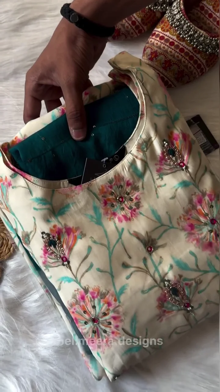 Exquisite Hand-Work: The front of the kurta is enhanced with delicate hand-embroidery, including sequins and beadwork centered within the floral motifs for a touch of subtle shimmer.