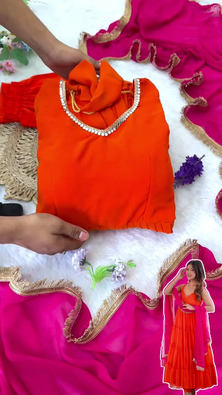 Vibrant Party Wear Gown Set: A striking ready-to-wear ensemble designed for festive occasions, featuring a bold and lively bright orange color that enhances your overall look instantly.