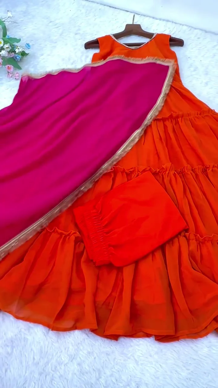 Vibrant Party Wear Gown Set with Ruffled Tiered Skirt in Bright Orange: Complete Outfit Featuring Golden Gota Patti Neckline and Contrasting Fuchsia Pink Dupatta with Matching Trousers