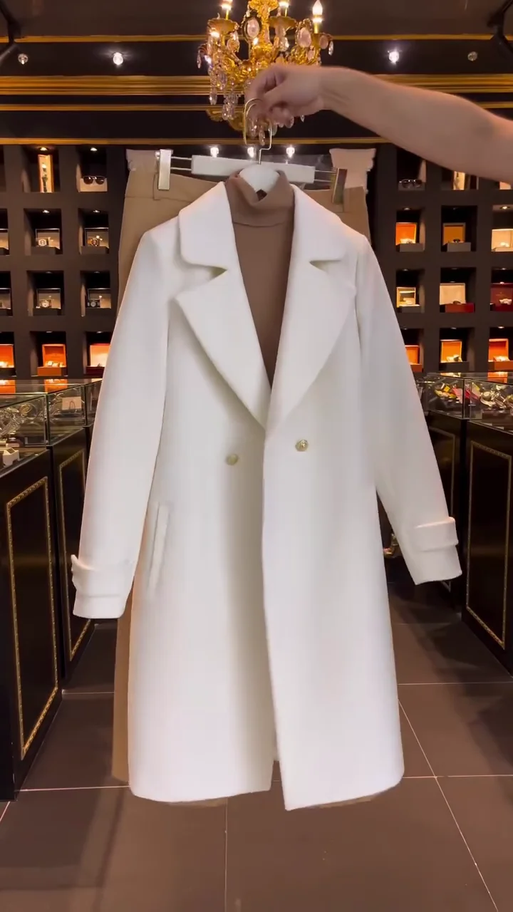 Women’s White Wool Blend Mid-Length Coat: Classic Double-Breasted Design with Notched Lapels and Long Sleeves for Polished Winter Wear